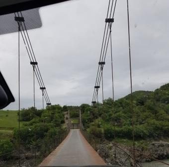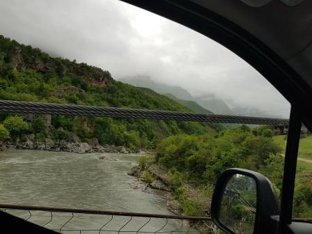 Auch unser Ziel sind die Berge, allerdings beginnt unsere Wanderung erst nach 20 Kilometern Autofahrt, davon gute drei Kilometer bis zum Bergdorf Strëmbec auf einer Piste. Über eine Hängebrücke geraten wir auf einen Schotterweg. Geschickt müssen die Schlaglöcher umfahren werden. Vor dem Ort parkten wir auf einer Wiese an einem Trafohäusschen.