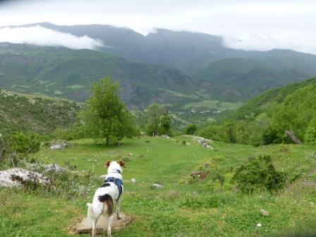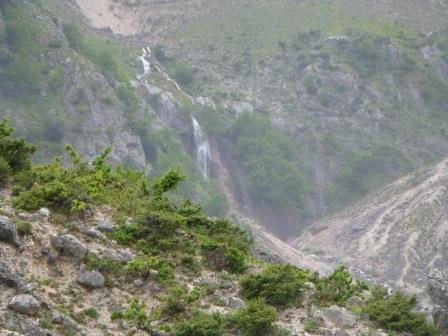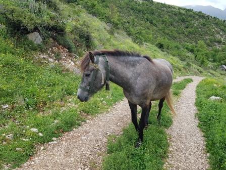 Dann ging es steil bergauf durch das Dorf um den Wasserfall Ujëvara e Sopotit zu erreichen. Durchs Dorf begleitet uns „Huppäät“ (vom Rheinischen ins Hochdeutsche übersetzt Hubert „HuPferd“), einem sehr freundlichen Pferd. Auf schmalen Wegen geht es stetig Bergauf, vorbei an Hängen, begleitet vom Gesang der Nachtigall. Weiter wandern wir über Wiesenterrassen bis ein Weg im Hang erreicht wird. Diesen Weg mussten wir mit einem Wasserlauf teilen.