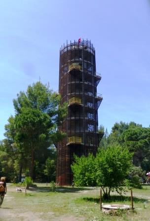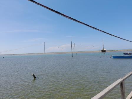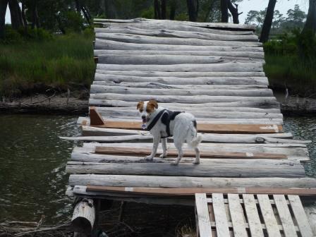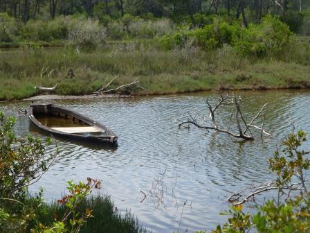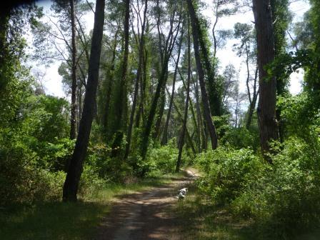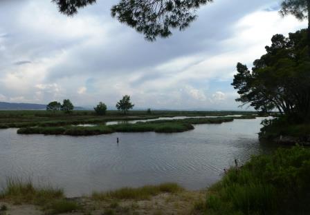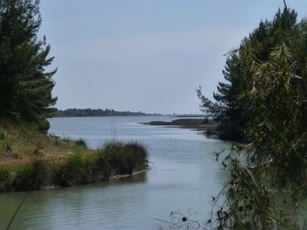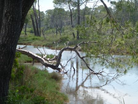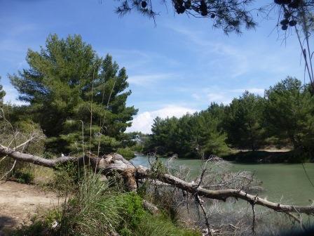 Es gibt reichlich Wanderwege durch den angrenzenden Wald zur Lagune, nicht immer sehr schattig. Wir wählten den Pelikan Weg, der mit 2,5 Kilometern angegeben war. Erst durch einen Pinienwald, bis die ersten Wasserläufe zu sehen waren. Dann an diesen vorbei bis zu einer abenteuerlichen Brücke, deren Mittelteil zusammengefallen ist. Das war das Ende der Wanderung, es ging den gleichen Weg zurück.