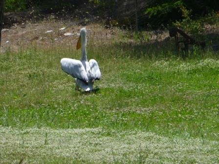 Das mit den Pelikanen holten wir dann am Infocenter nach, denn dort gibt es einen „Flügellahmen Pelikan“, der sogar noch einen Kumpel zu Besuch hatte.