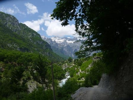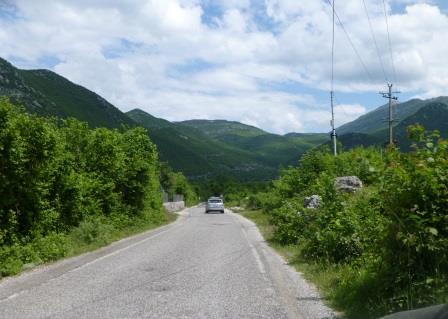 Die knappen 80 km dorthin wurden mit zwei Stunden Fahrzeit angegeben. Nachdem wir aus Shkodra heraus waren ging es auf einer gut ausgebauten, neuen Straße recht flott voran. Bei Koplik verließen wir die gut ausgebaute Straße und fuhren langsam Richtung Berge. Die Straße verengte sich merklich, doch mit einem gut geschulten Auge für die Breite des Autos kamen wir mit dem schnellen Gegenverkehr klar. Auf dem Höhenmesser des Navis war zu sehen, dass wir beständig Bergauf fuhren.