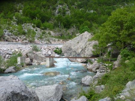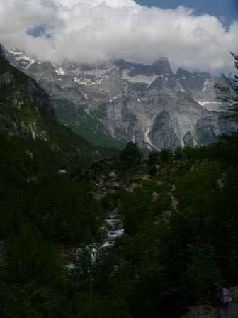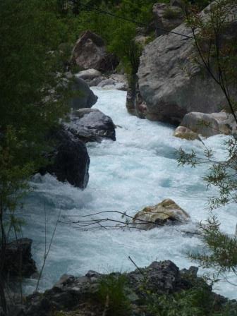 800 Höhenmetern den Zielort erreichten. Nachdem wir die etwas schwierig zu findende Unterkunft bezogen hatten erkundeten wir erst einmal das Dorf. Begleitet von einem rasch fließendem Wildbach, der Shala, kamen wir an einem sehr exklusiven Hotel vorbei, das auf Bildern damit warb, einen wunderschönen Whirlpool mitten im Zimmer stehen zu haben mit Blick auf den Wildbach.