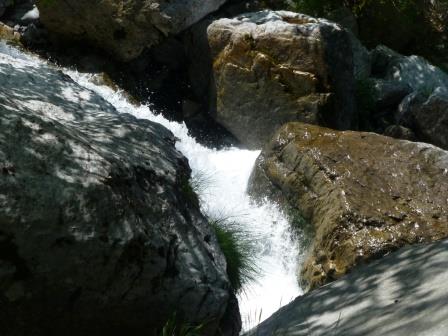 Erst einmal parallel zum Wildbach das Dorf durchqueren, weiter geradeaus immer der Beschilderung folgend verwandelte sich der munter dahin fließende Wildbach zu einer wahren Hölle. Allerdings ohne Feuer, im Gegenteil. Tiefe Abfälle zwischen haushohen Felsbrocken, so wälzte er sich das Tal herunter. Wer dort hineingefallen wäre hatte keine Chance mehr sein Leben noch länger zu genießen.