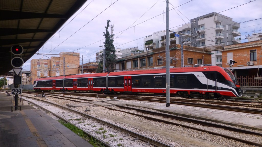 Um diesen Bahnhof von der 25 Kilometer entfernten Stadt Molfetta zu erreichen benutze ich die Eisenbahn. Am Schalter bediente mich eine entspannte Schalterbeamtin. Als ich beim Fahrpreis von 4 Euro für Hin- und Rückfahrt das Gesicht etwas erstaunt verzog, meinte sie: „Ob das denn zu teuer wäre?“