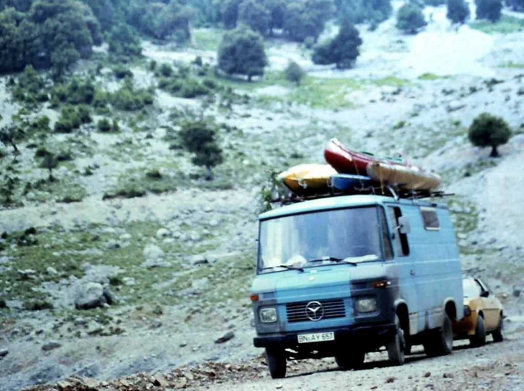 Der Jürgen studierte gerade das Berechnen von Transistoren, seine damalige Freundin hatte auch gerade mal zwei Monate Zeit, so beschlossen wir, mit einem zum Wohnmobil umgebauten Mercedes 508 D, 2,5 Liter Hubraum, 80 PS eine Reise nach Griechenland zu unternehmen, um den Kanusport auszuüben.