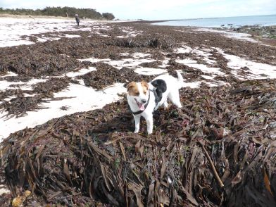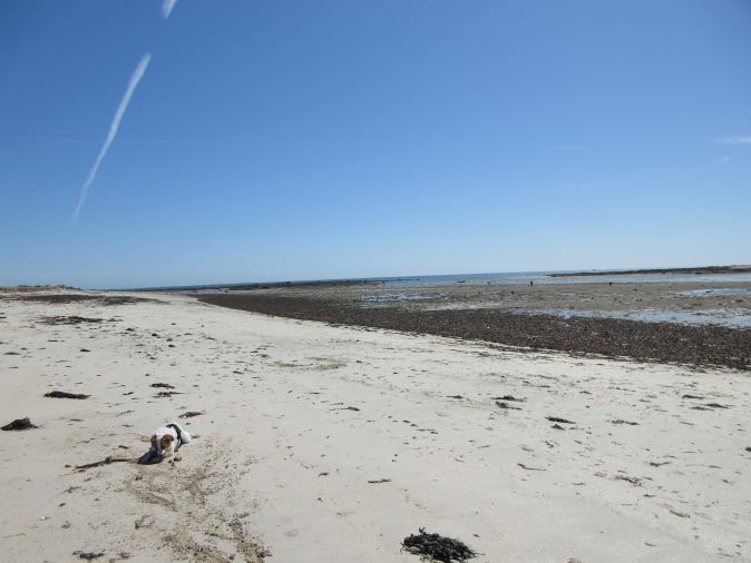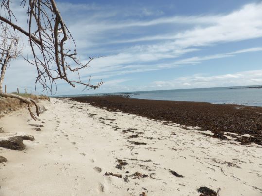 Wir beginnen unsere Wanderung im Ortsteil Kerity der Gemeinde Penmarch und folgen dem GR34. Ab und zu weichen wir vom linken Wege ab und begeben uns an den rechts befindlichen Sandstrand; Schuhe aus und immer an der Wasserlinie vorbei. Das ist nicht immer einfach, denn die Stürme haben auch riesige Mengen von Algen an den Strand gespült.