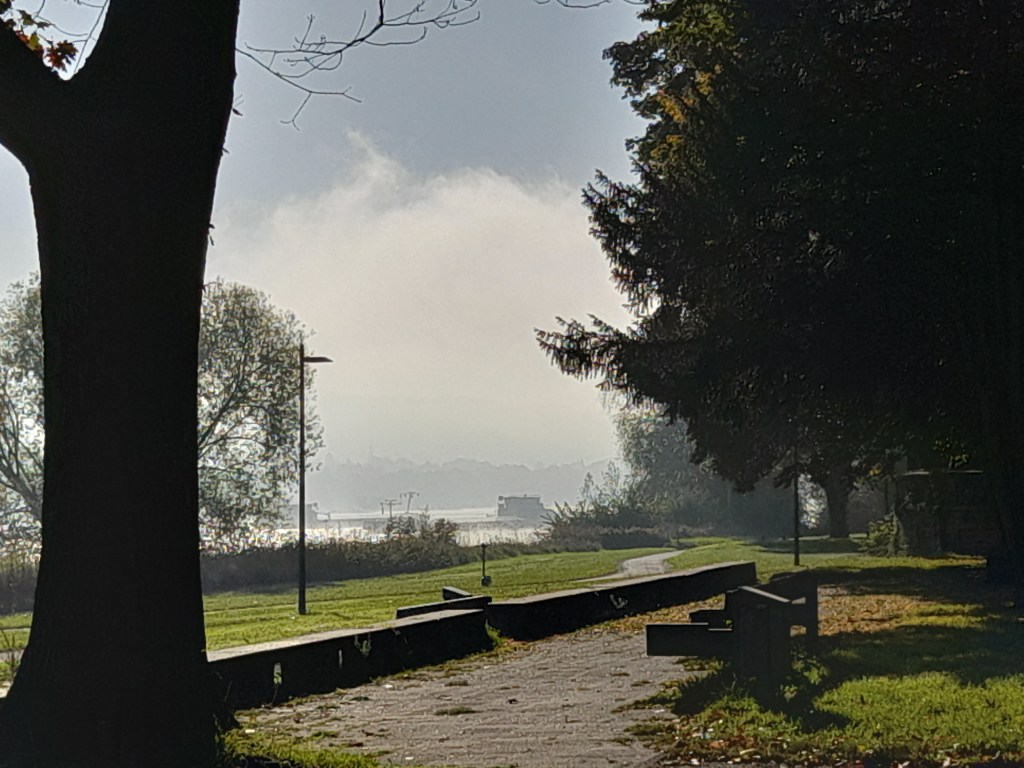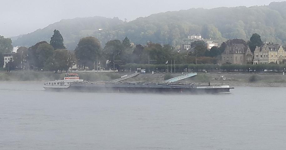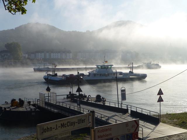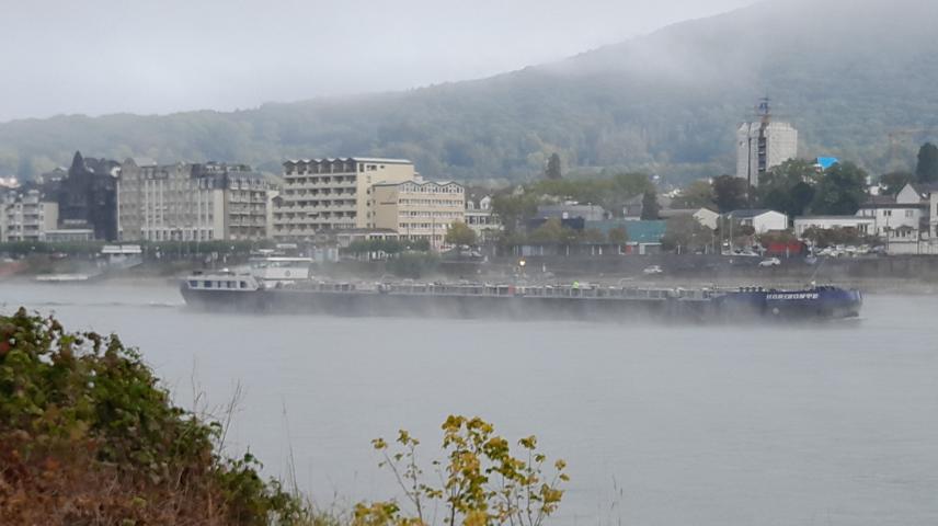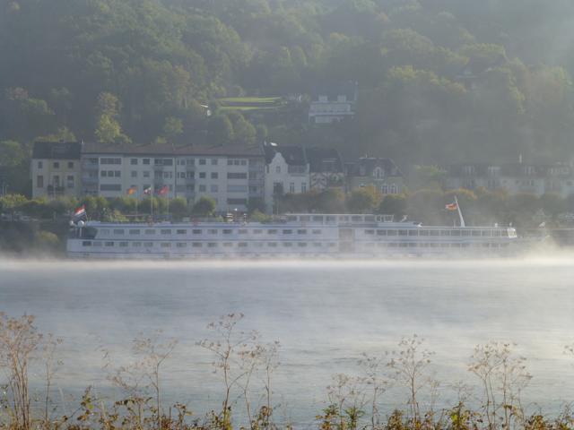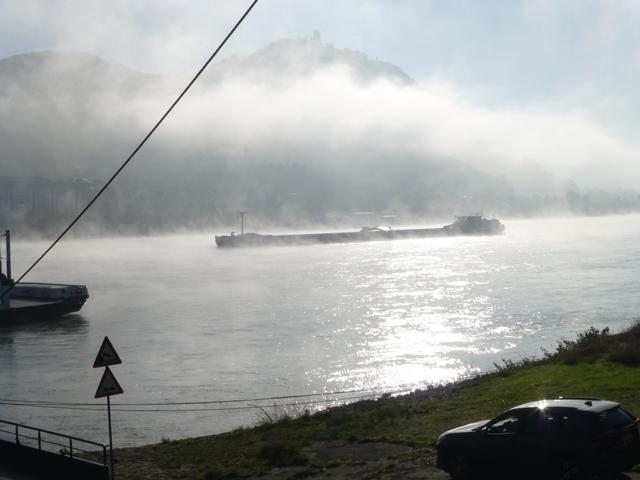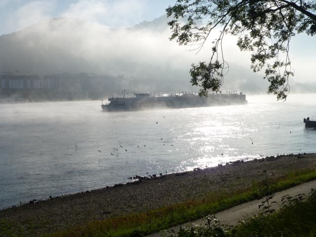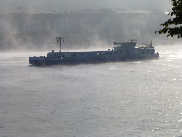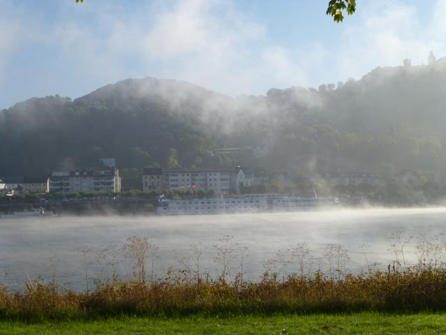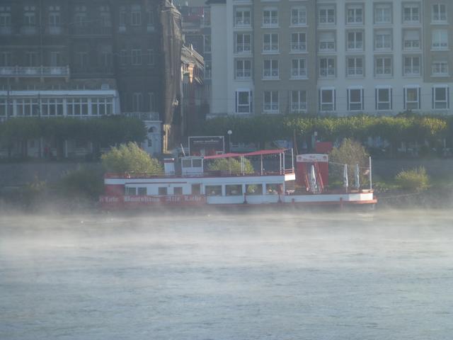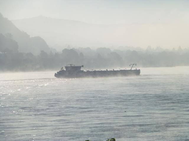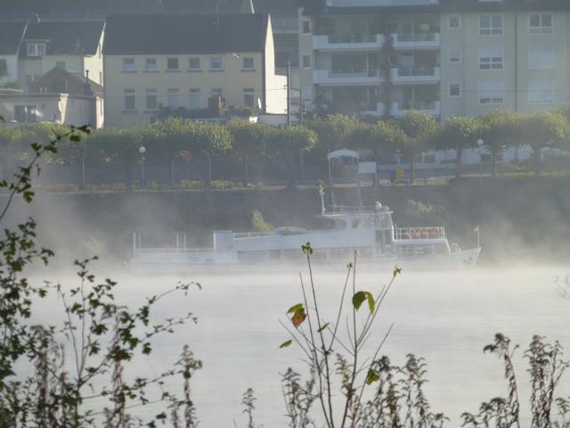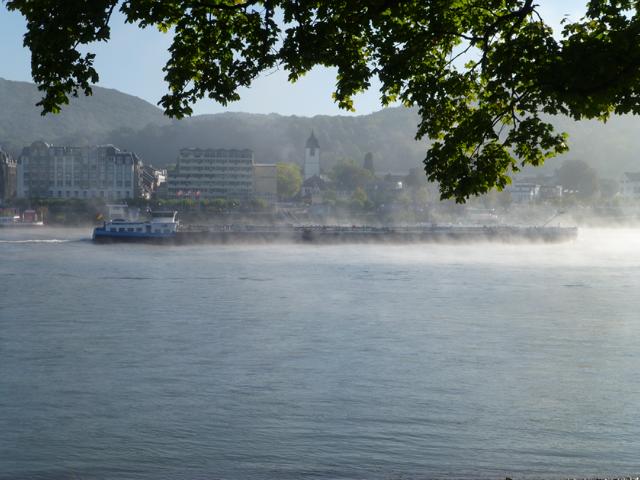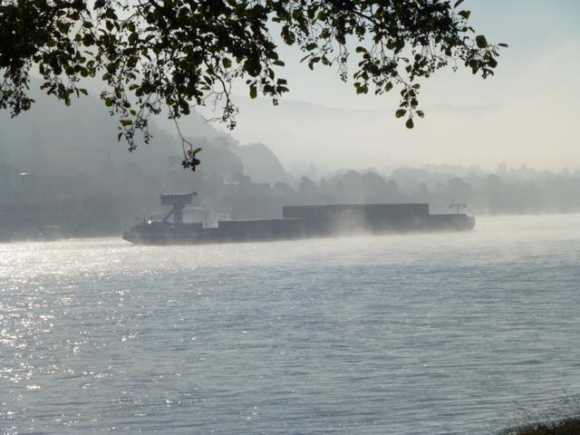 Wenn die Kälte der Nacht von der Sonne vertrieben wird, steigt häufig Nebel aus dem sich erwärmenden Wasser des Rheines. Manchmal ist er so dicht, dass ein Schiffsverkehr nur noch mit Hilfe eines Radars möglich ist. Der Nebel verschluckt auch manches Geräusch, so dass ein Fahren auf Gehör wenig ratsam ist.
