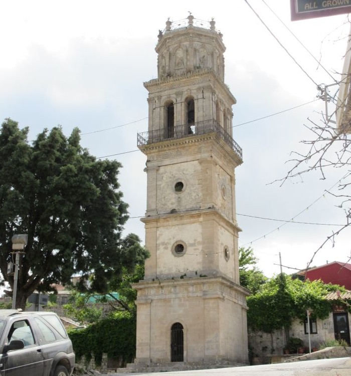 Mitten im Dorf steht die Kirche Agios Nikolaos. Ihr steinerner Glockenturm aus dem späten Mittelalter ist einer der höchsten der Insel. Gegegenüber befindet sich, na was?