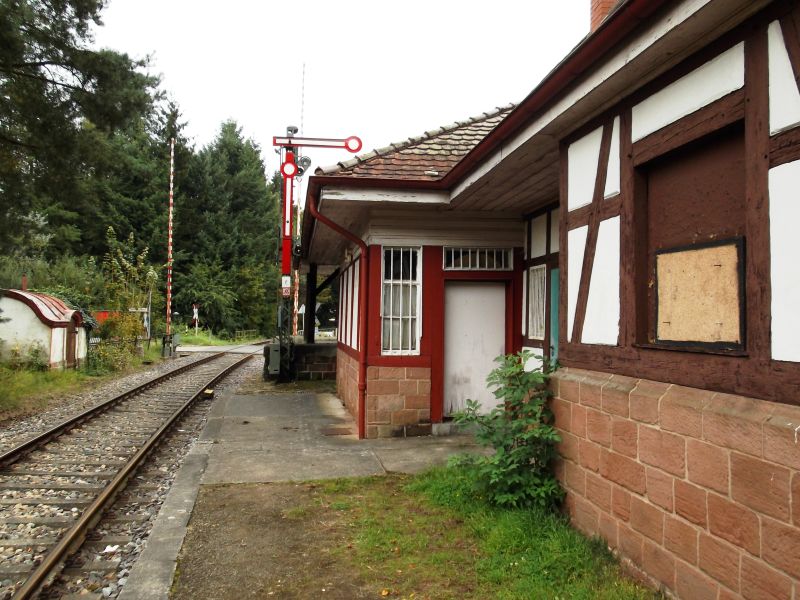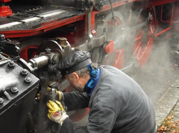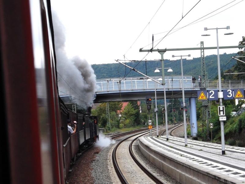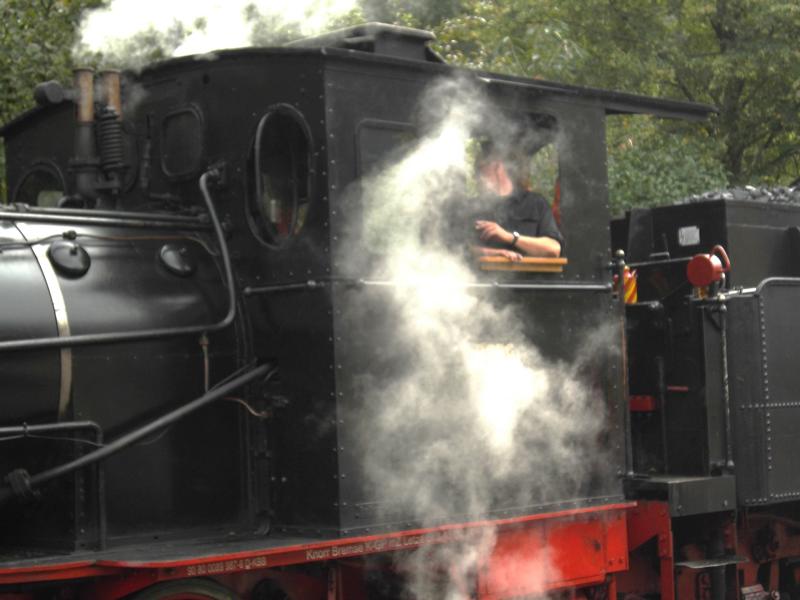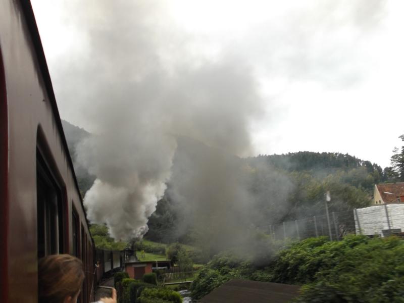 Die feuchten Gleise und das Herbstlaub hätten uns nach einer Notbremsung fast nicht mehr anfahren lassen, aber die Lokführer haben es mit viel Feingefühl geschafft, den doch recht imposanten Zug wieder in Fahrt zu bekommen. Die zweite Fahrt begleitete ich mit dem Auto, leider regnete es ziemlich heftig an diesem Sonntag. Schade auch für viele Veranstaltungen, die fielen förmlich ins Wasser.