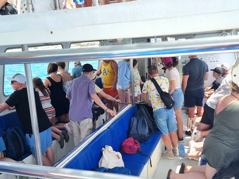 Als wir eine halbe Stunde vor Abfahrt des Bootes ankamen, stellten wir das Auto auf dem Cameo Island ab. Diese Insel besteht aus einem Parkplatz für gefühlt hunderte von Autos, und na ja, gefühlt halb so vielen Bussen, ohne Schatten.