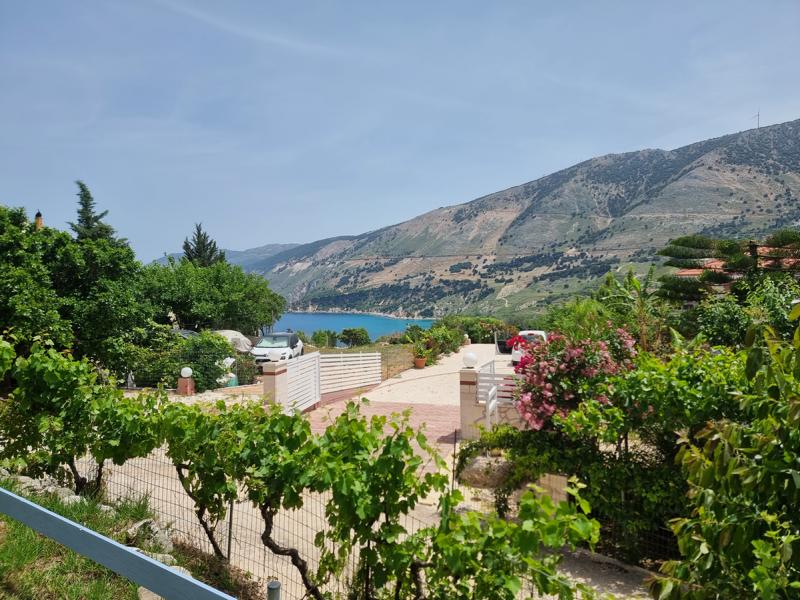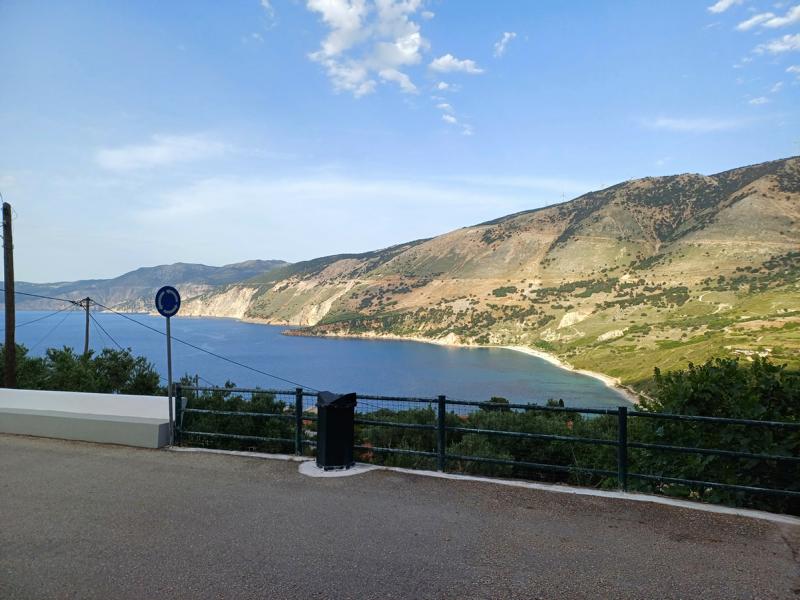 Wir fahren nach einem zweiten Frühstück, schließlich sind wir schon 15 KM geschwommen, weiter zum nächsten Domizil. Der Weg nach Zola zeigt schon einmal den Character der Insel, ganz anders als Zakynthos. Es ist alles erheblich weniger touristisch und irgendwie grüner. Der Ort Zola ist auf der Halbinsel Paliki zu finden, mit tollem Blick auf die Bucht von Agia Kiriaki, wenn wir ganz vorne zum Zaun gehen.