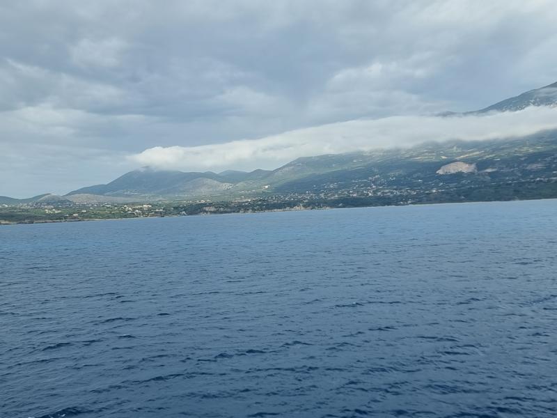 Nach einem guten Frühstück nehmen wir in der Frühe die Fähre zur Insel Kefalonia. Wie schon berichtet, versah die Fähre ihren Dienst an diesem Freitag und überraschte uns mit einer pünktlichen Abfahrt. Unter einem Sonnendach sitzen wir auf dem Oberdeck, die Fahrt ist traumhaft. Die Entfernung zwischen Agios Nikolaos und Pessada beträgt 15 km, dafür benötigt die Fähre eineinhalb Stunden.