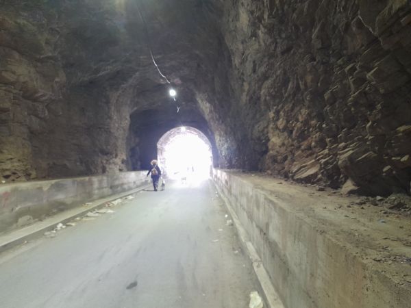 Wir liefen 500 m durch diesen Tunnel, und „Das Licht am Ende des Tunnels“ waren die beiden Fähren über dem Koman See, die mit Fahrzeugen beladen wurden. Bitte Rückwärts auf die Fähre fahren.