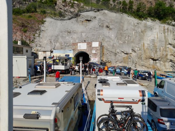 Wir schafften es dann tatsächlich in gut zwei Stunden 500 Meter vor unserem Zielort zu sein. Doch zwischen uns und der Fähre lag noch ein Tunnel. Am Eingang des Tunnels zur Fähre wurden wir angehalten und mussten dort parken, und den Tunnel zu Fuß durchlaufen. Das Parken kostete 500 LEK bar auf die Kralle des Parkwächters.