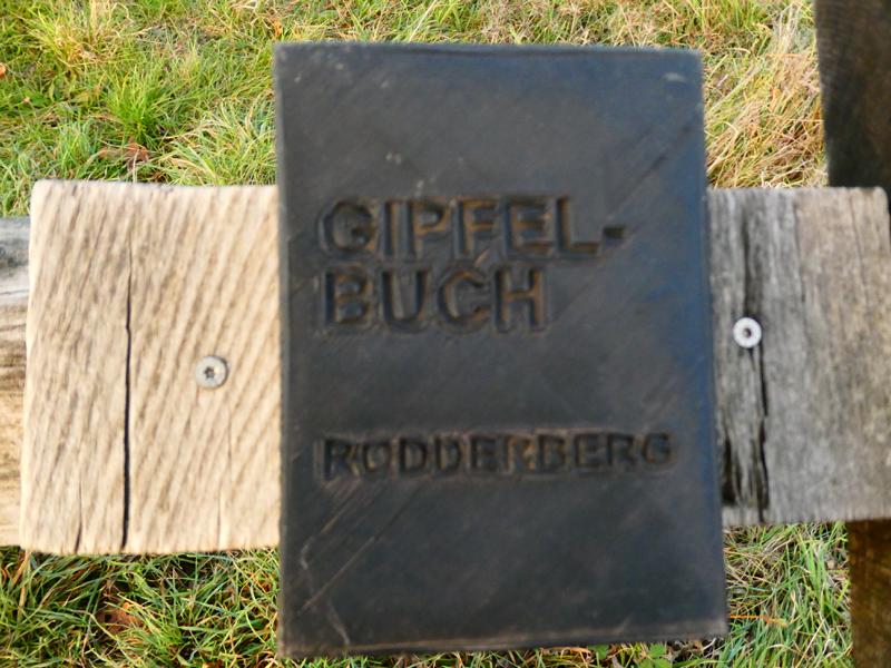 Etwas weiter haben wir die Wahl, wir können weiter auf der Fahrstraße laufen oder auf einen nach links gehenden schmalen Pfad, der uns auf den „Gipfel“ bringt, mit einem herrlichen Rundumblick. Und dem Eintrag ins „Gipfelbuch“.