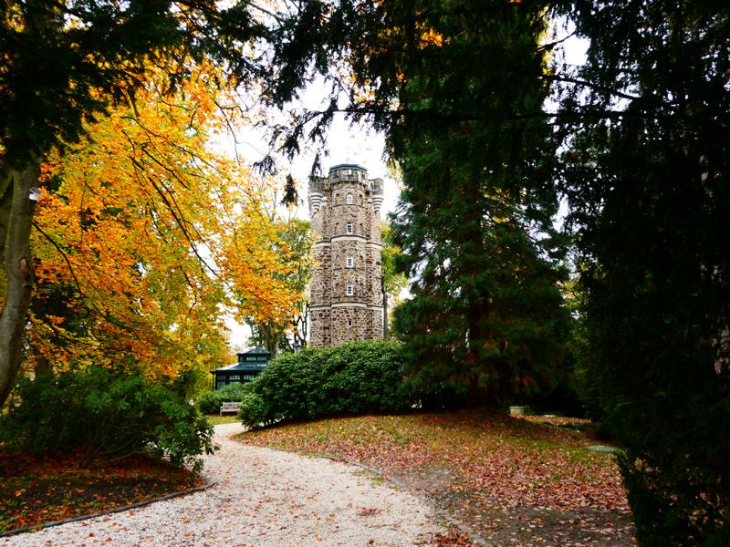 Durch die Büsche sehen wir den etwas abseitsstehenden Humboldt-Turm. Dieser wurde 1848 erbaut und steht unter Denkmalschutz.