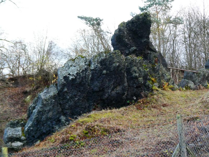 Wir sehen etwas versteckt links den Basaltlavagang. Der Gang ist ein aus Leucit–Nephelinit bestehendes Überbleibsel der vulkanischen Aktivität.