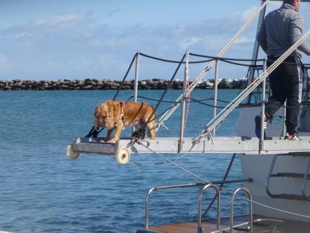 Griechischer Schiffshund kann es kaum erwarten, an Land zu kommen.
