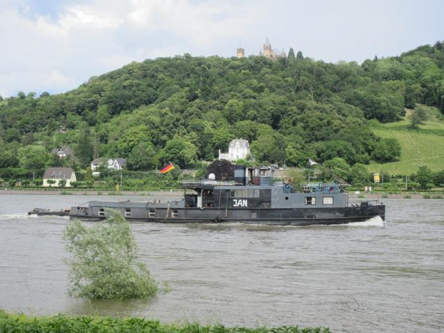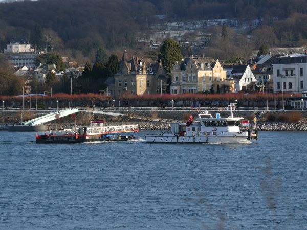 Liebe Schiffer gebt fein Acht, der Brückenklau die Runde macht. Viking Orvar zu Berg vor Königswinter. Schleppt eine Anlegebrücke nach Oberwinter zur Werft.