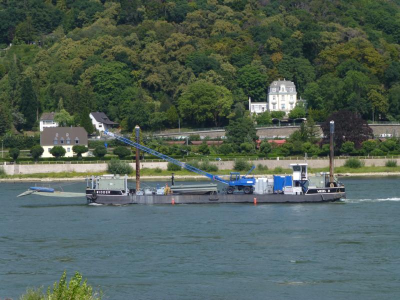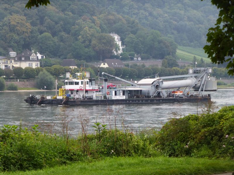 Das Tauchglockenschiff Carl Straat am 29.8.2023 zu Tal vor Bonn-Mehlem. Vermutlich war es auf dem Weg nach Duisburg, wo es jetzt als technisches Denkmal zu sehen ist.