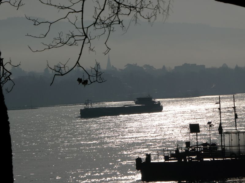 Autofähre Königswinter IV im Gegenlicht. Rhein Kilometer 645