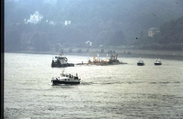 „Bergung“ Feuerlöschboot Bonn durch Arbeitsboot Cassius, nachdem sich Bonn festgefahren hat bei Rhein KM 644.