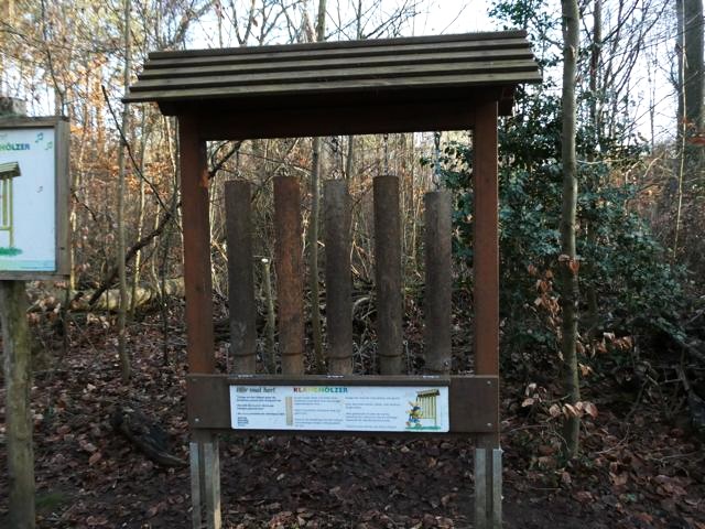 Wir folgen der Beschilderung und kommen an die Klanghölzer. Je nach Holzkörper erklingen unterschiedliche Töne, wie eindeutig zu hören war. Den Klöppel fand jemand wohl so toll, dass er einfach mitgenommen wurde.