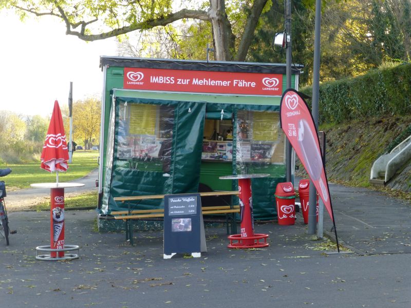 Wir begeben uns zurück zum Rhein und folgen ihm Stromaufwärts. Nach passieren der Fähranlegestelle können wir von Februar bis November bei Mahmoud Moraa im Imbiss an der Mehlemer Fähre unseren Hunger oder Durst stillen. Mahmoud steht von Frühmorgens bis abends in seinem Imbiss, sieben Tage die Woche.