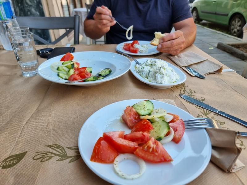 Wir beschließen, kurz vor der Grenze zu Nord-Mazedonien noch in Griechenland etwas zu essen, haben wir doch weder Mazedonische– noch Serbische Dinars. Außerdem zeigt die Uhr mittlerweile fast fünf und wir spüren unsere leeren Mägen. Wir fahren von der Autobahn hinunter und landen in Polycastro, einem kleinen Städtchen. Wir suchen uns eine Taverne. Die Gastleute sind unglaublich nett und wir bestellen einen Gurken-Tomatensalat sowie Tsatziki als Appetizer. Souvlaki und Hähnchen in Limonensauce als Hauptgang. Die Portionen sind riesig und der Preis beträgt so ungefähr die Hälfte von den Preisen auf den Ionischen Inseln.